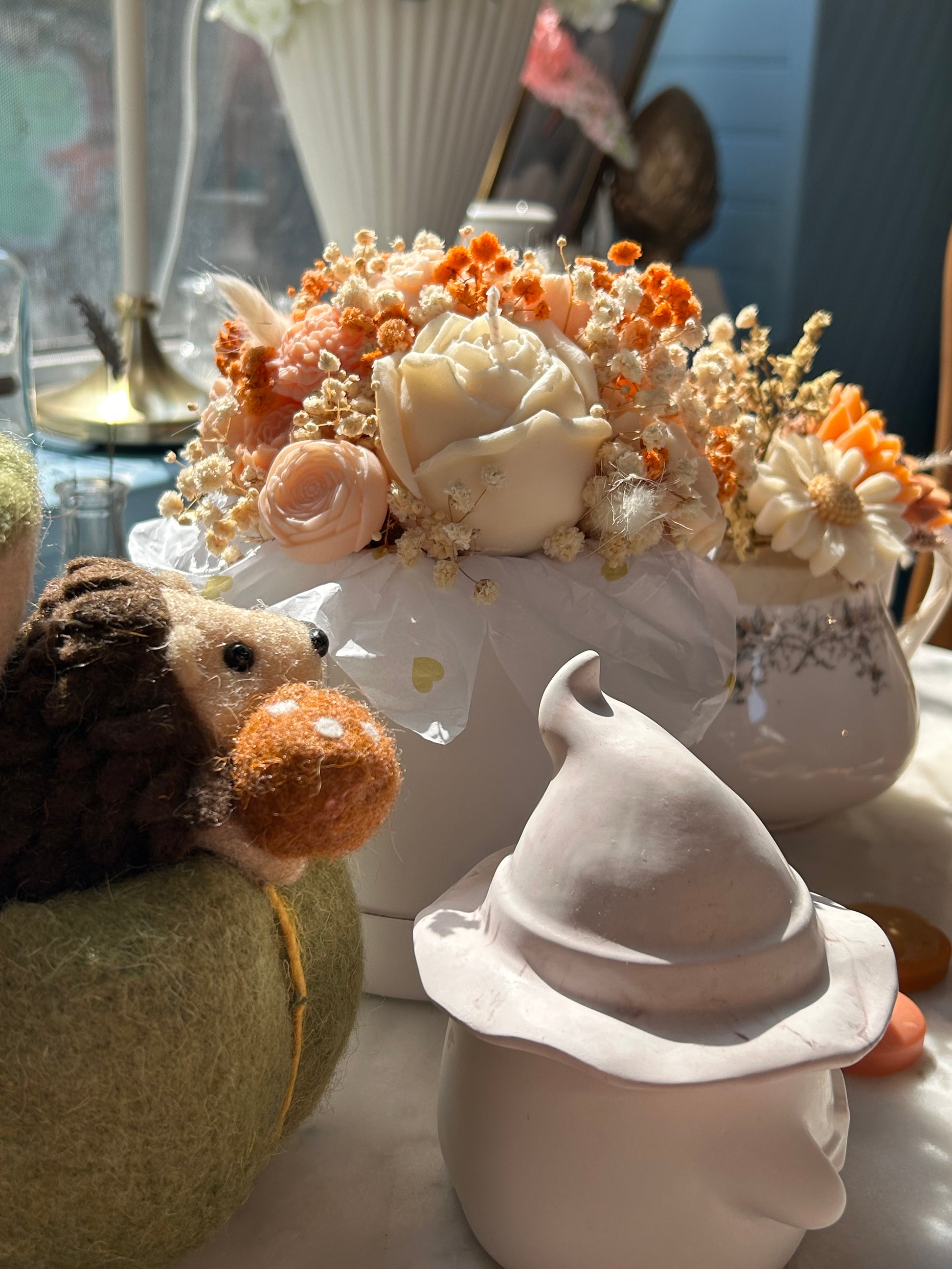 Plus qu’une simple bougie, c’est une véritable décoration poétique qui apporte chaleur, douceur et originalité à votre intérieur. Une pièce unique qui marie élégance florale et charme automnale.