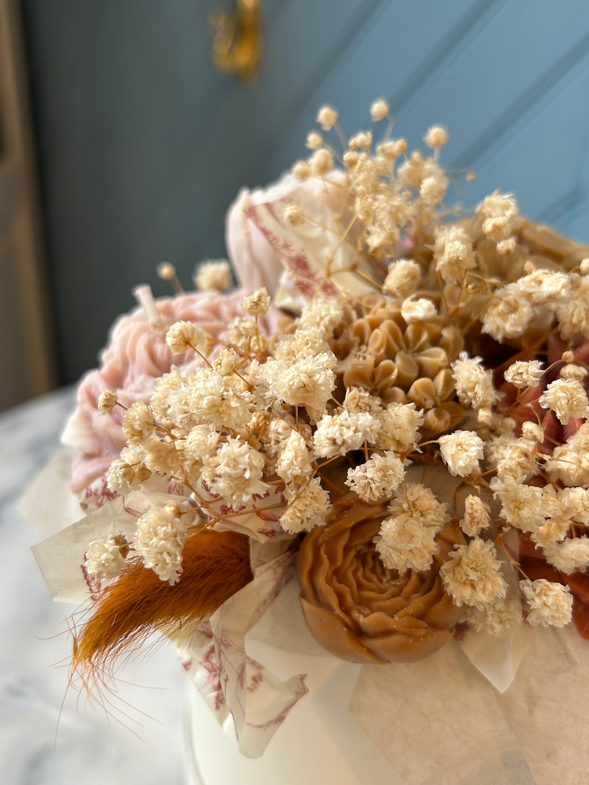 Composé de plusieurs fleurs en cire de soja et parfums de grasse ce bouquet est fait pour vous. Aux couleurs de l’automne il sera être une véritable pièce maîtresse de votre intérieur.