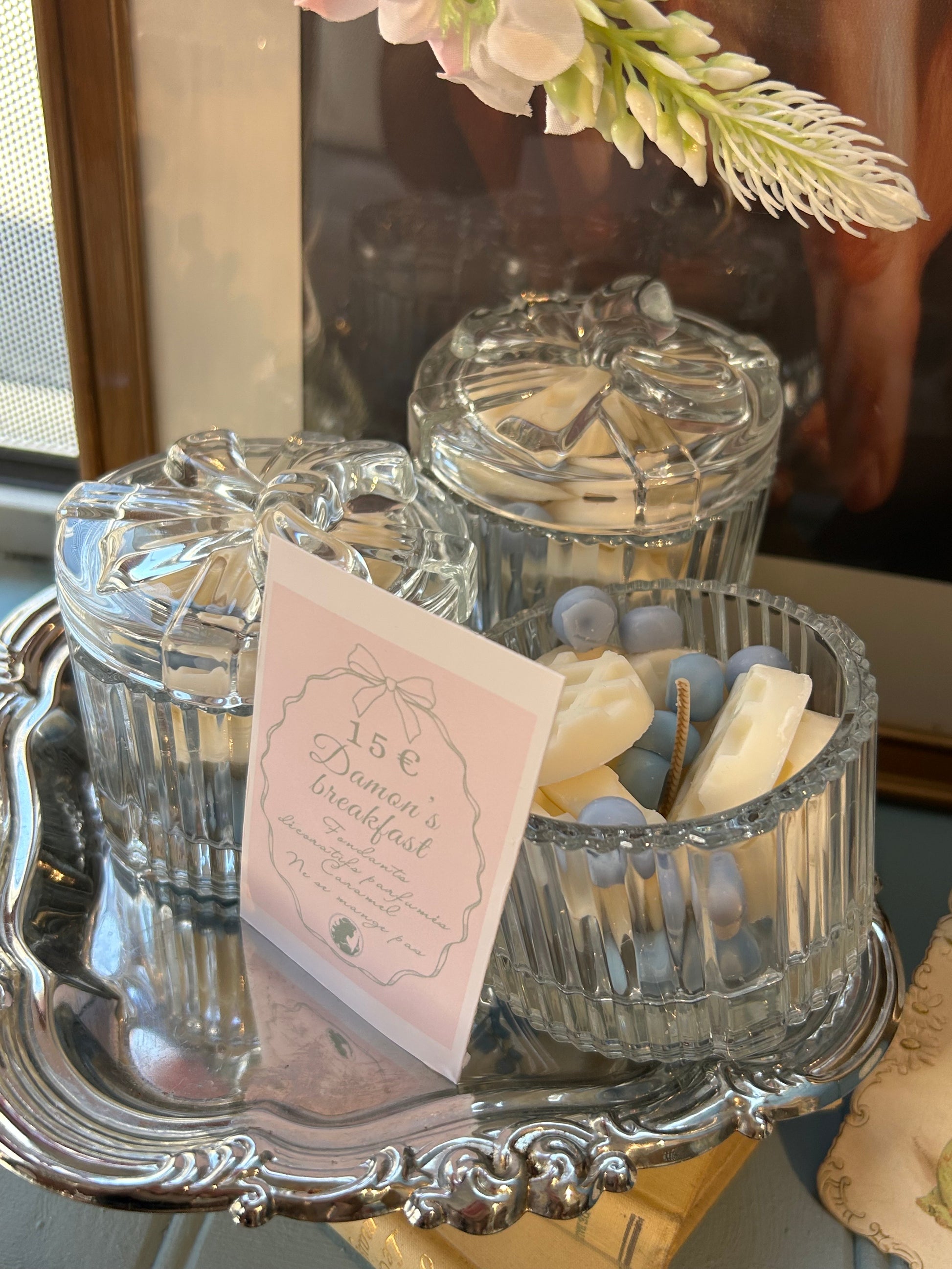 Mini gaufres dorées, myrtilles juteuses, et un parfum de caramel chaud : cette bougie rend hommage au petit déjeuner que Damon préparait pour Bonnie. Présentée dans un pot en verre réutilisable en boîte à bijoux, elle mêle tendresse, gourmandise et souvenirs inavoués.