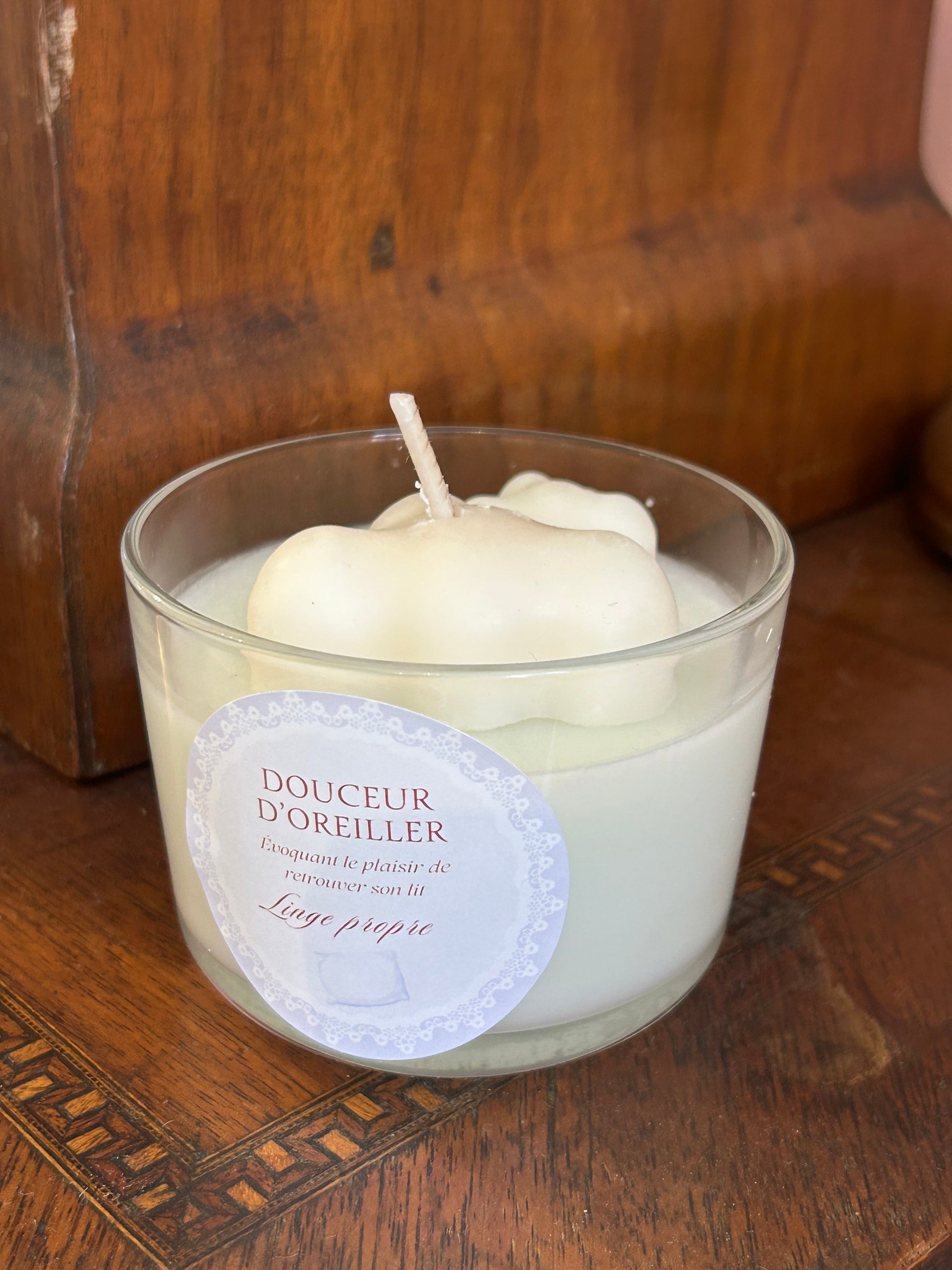 Nichée dans un pot en verre transparent, Douceur d’Oreiller dévoile une cire bleu pastel, coiffée d’un petit nuage blanc en cire, tout en légèreté. Son parfum de linge propre emplit l’air de fraîcheur et de douceur, rappelant les draps immaculés d’un lit fraîchement préparé. Une bougie apaisante, pensée comme une caresse avant la nuit, pour transformer chaque instant en cocon de sérénité.