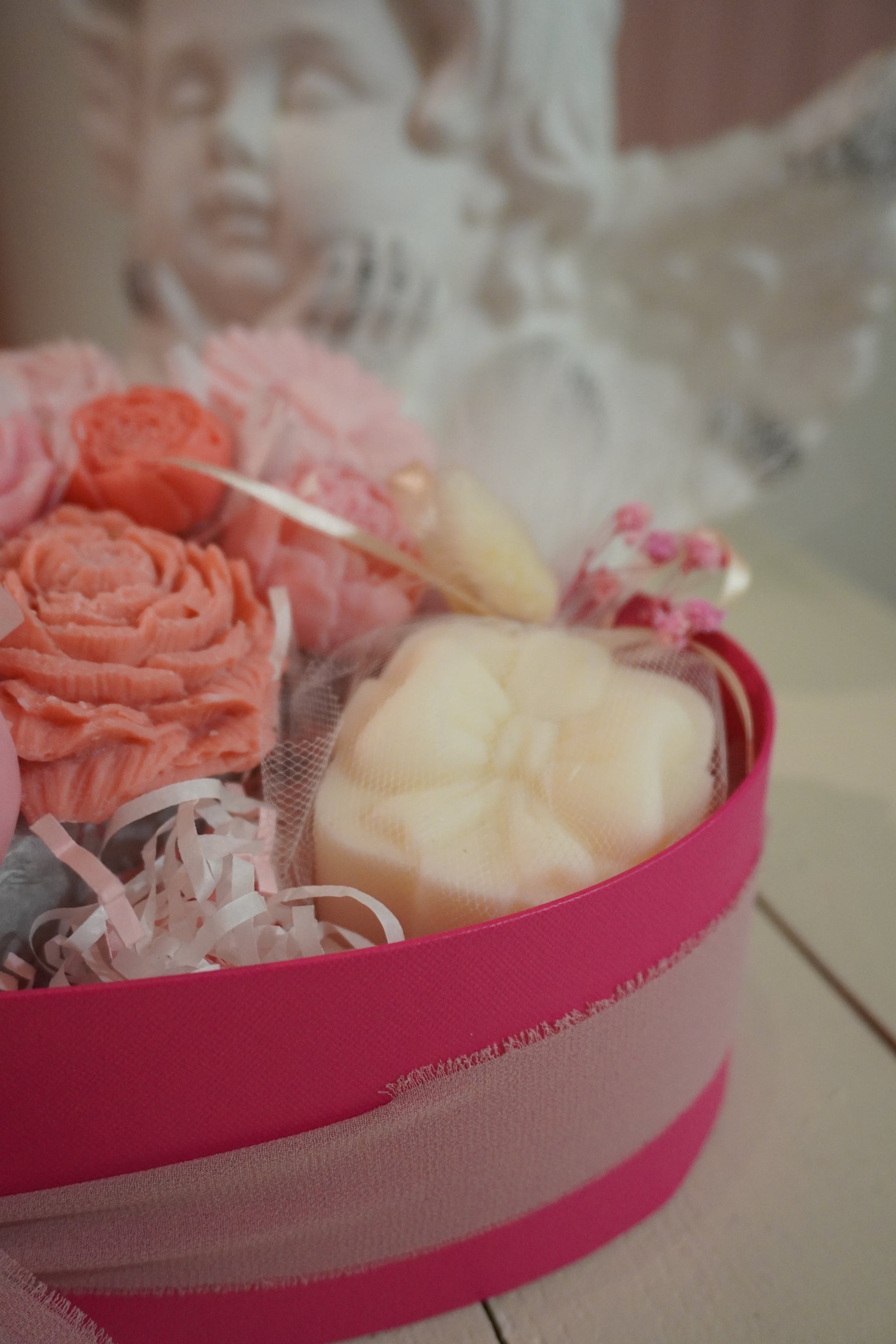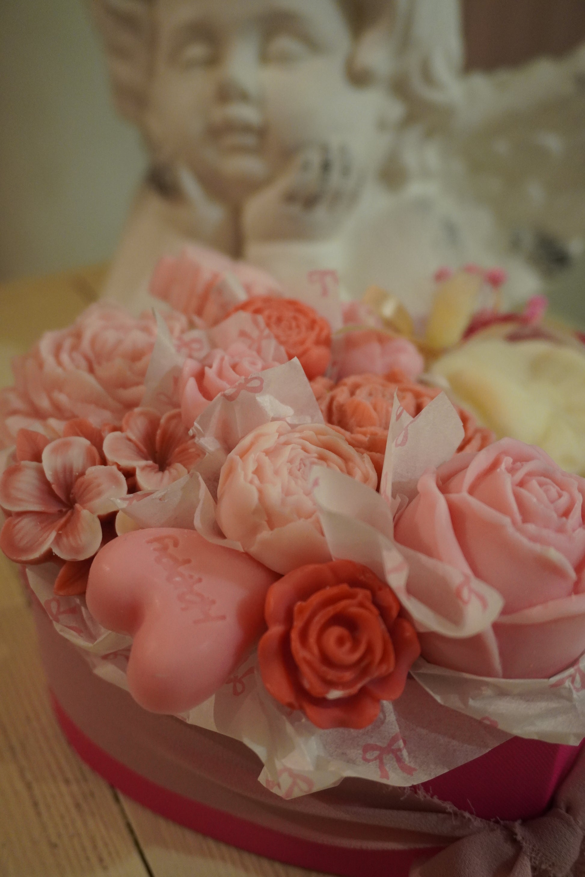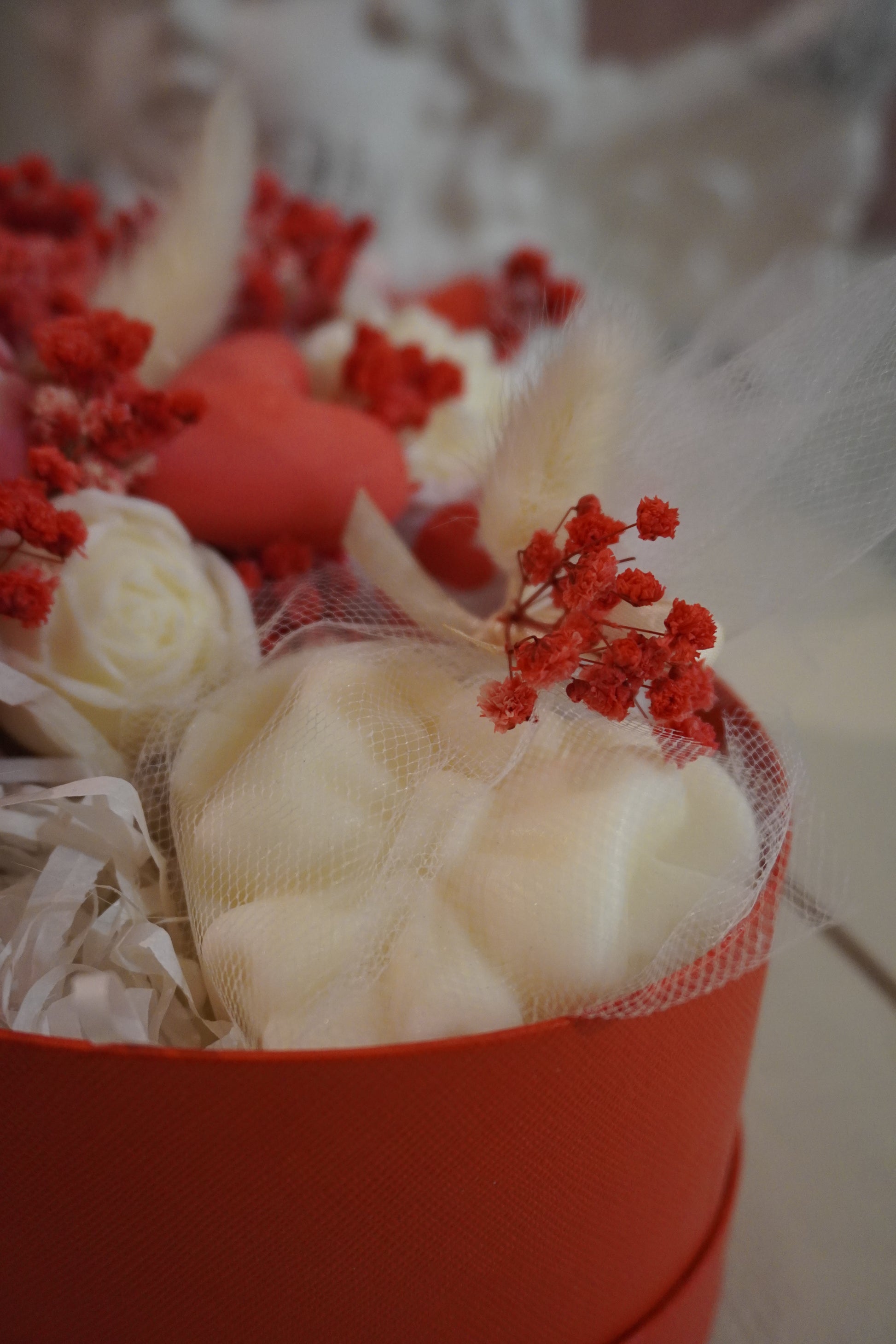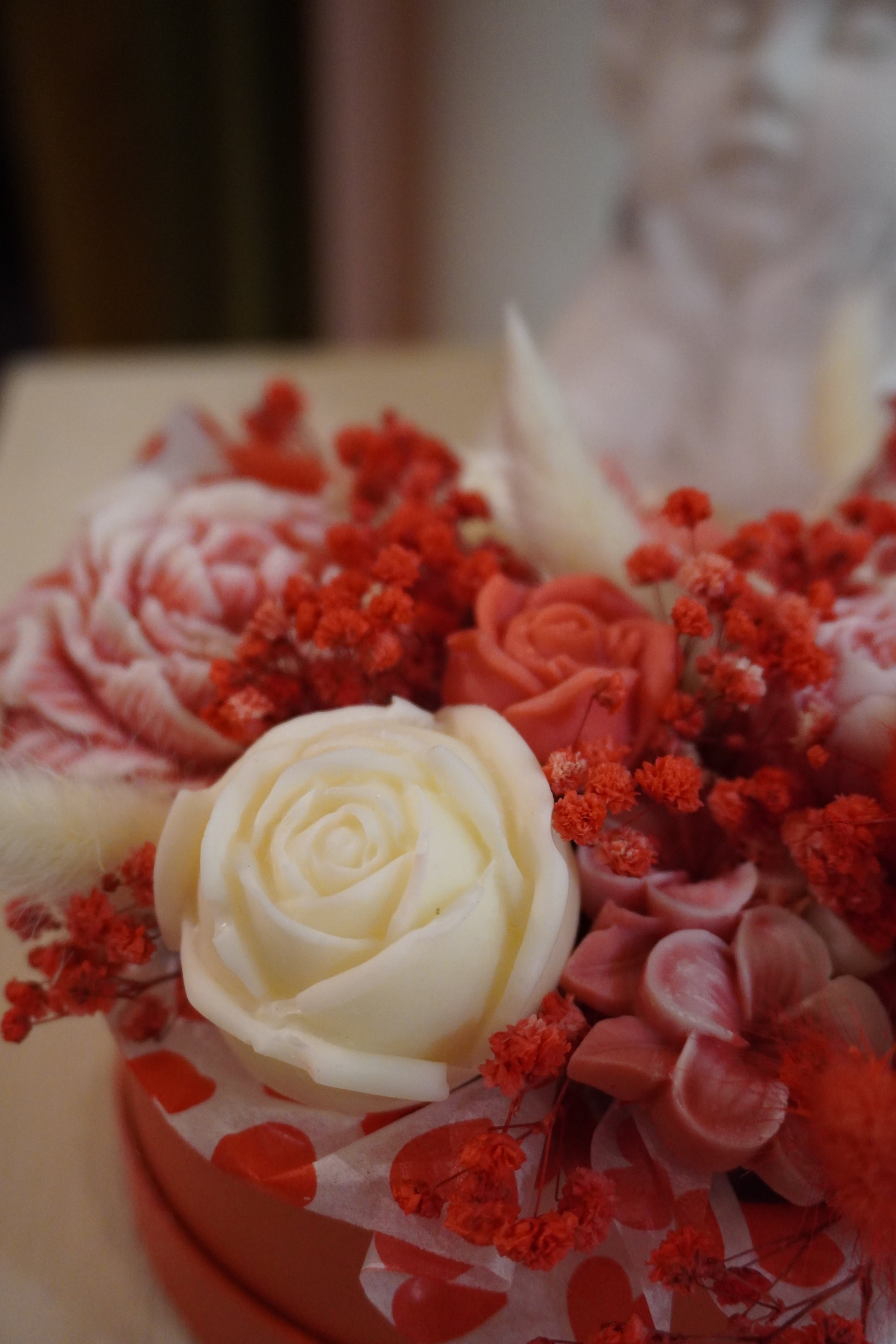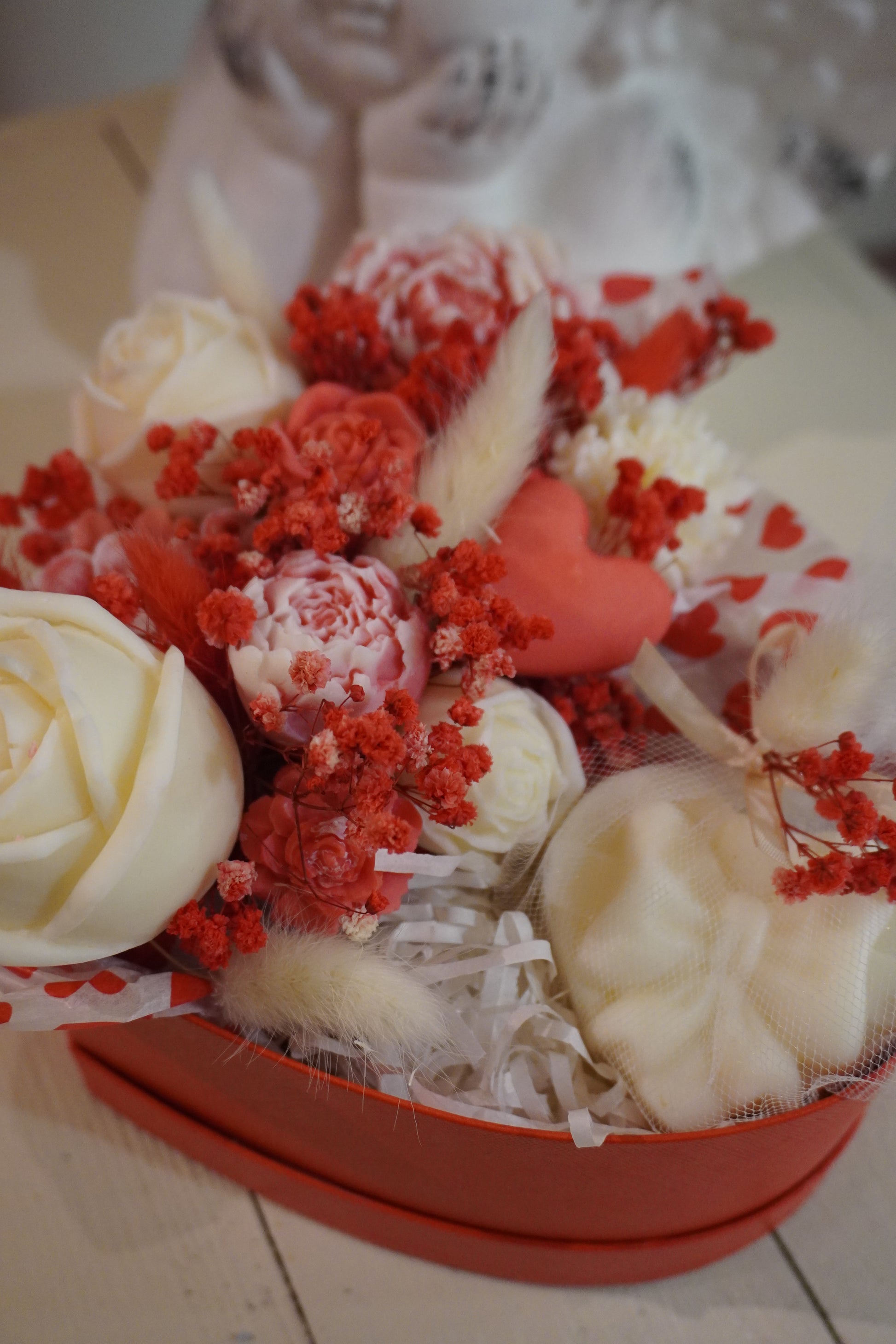 Célébrez l’amour avec élégance grâce à Fall in love again, notre bouquet unique présenté dans une boîte en forme de cœur rouge ou rose. Une moitié de ce coffret renferme un délicat bouquet de fleurs en bougie, et l’autre moitié un gros fondant parfumé en forme de cadeau.