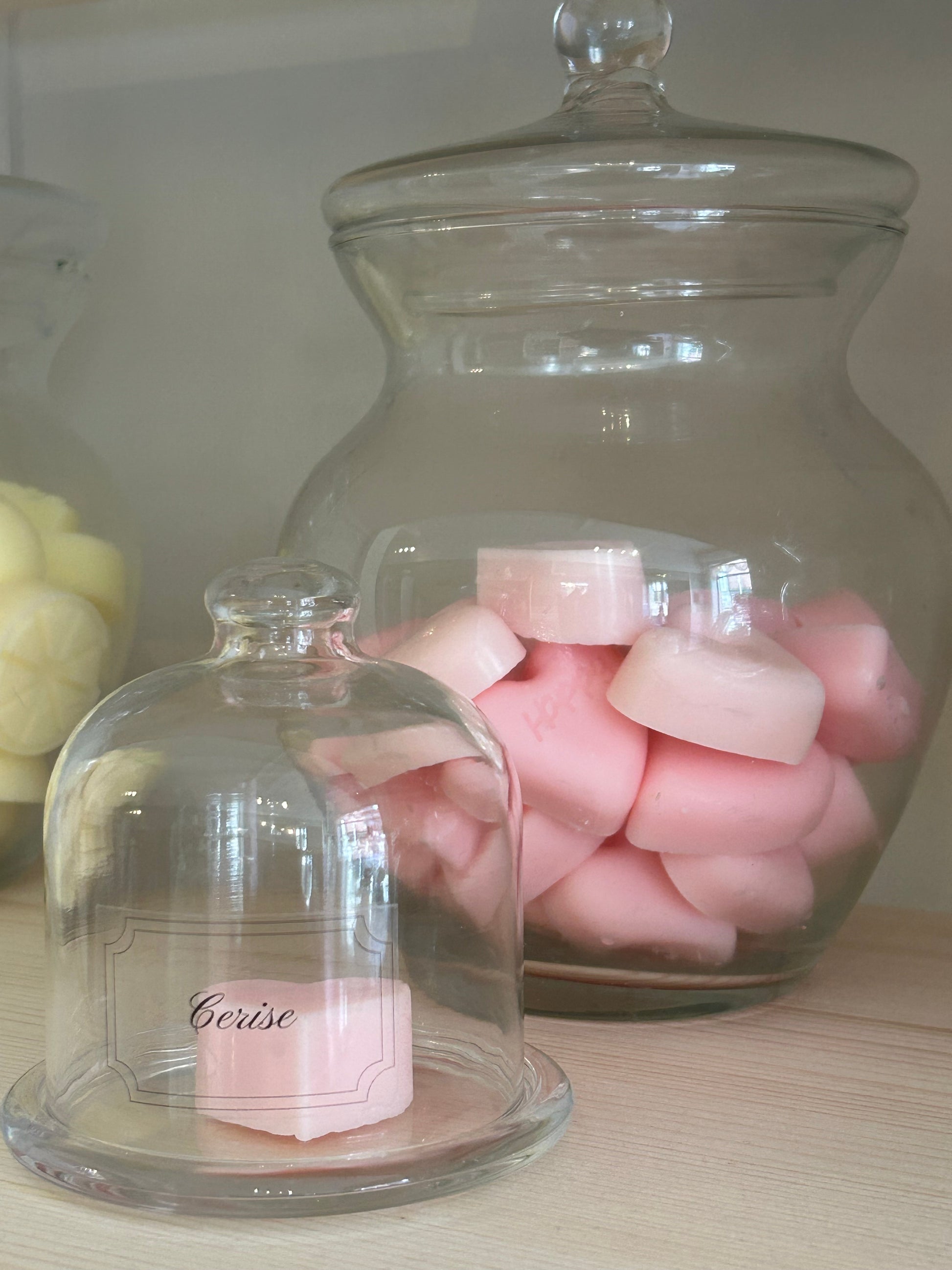 En forme de tendres cœurs, ces fondants parfumés à la cerise rappellent les douceurs rouges et brillantes que l’on déposait dans de jolies coupelles en cristal lors des réceptions estivales. Leur parfum sucré et juteux embaume l’air d’une gourmandise raffinée, comme une invitation à la rêverie au cœur d’un verger en fleurs. Une senteur pleine de charme, à faire fondre pour éveiller les sens avec délicatesse.