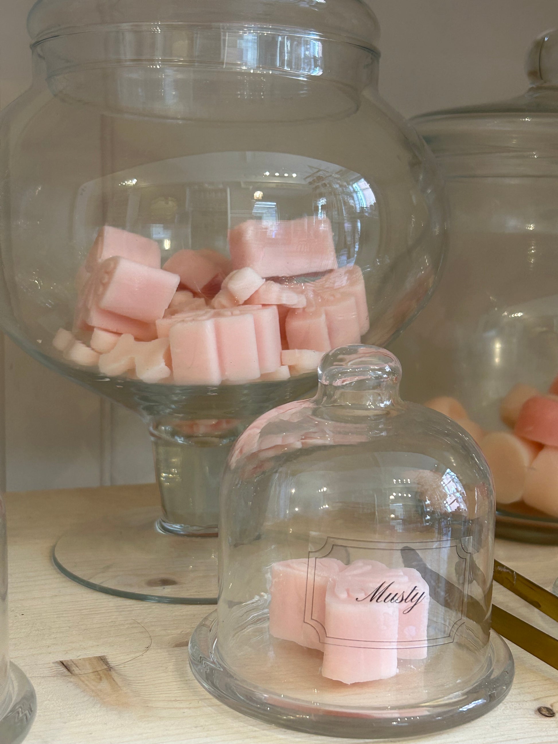 Succombez à nos fondants en forme de nœuds roses, délicatement parfumés au Musty. 10 € les 100 g, pour un moment gourmand et raffiné, à offrir ou à savourer chez soi.