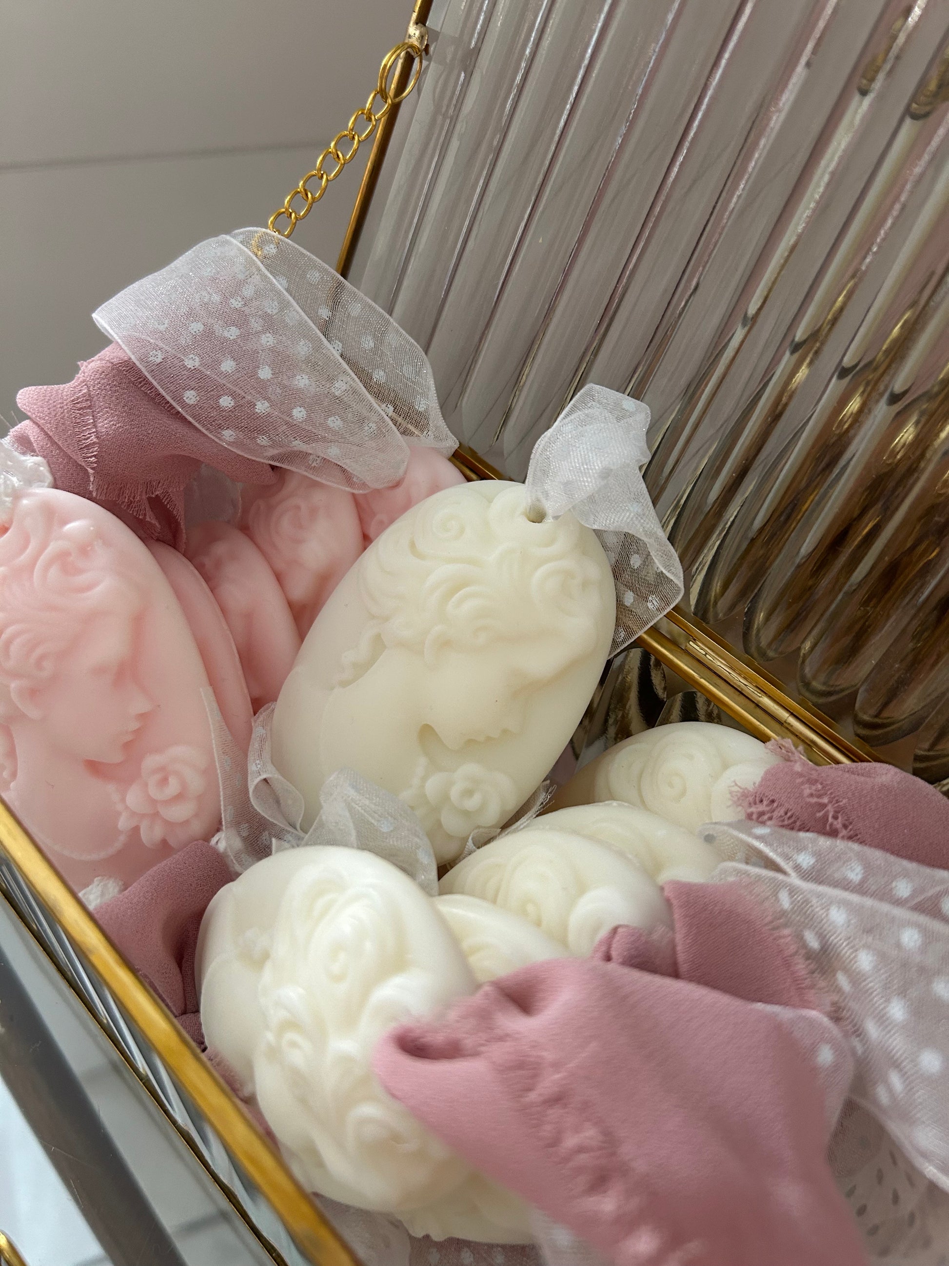 Couronnée du titre le plus gracieux, La Duchesse se présente sous la forme d’un camée de cire, décliné en rose poudré ou en blanc ivoire. Ses traits délicatement ciselés rappellent les portraits que l’on arborait fièrement aux bals de la haute société. Déposé sur une commode ou niché près d’une flamme, ce camée enveloppe votre décor d’un charme aristocratique, comme un doux murmure de l’époque Regency venu sublimer le présent.