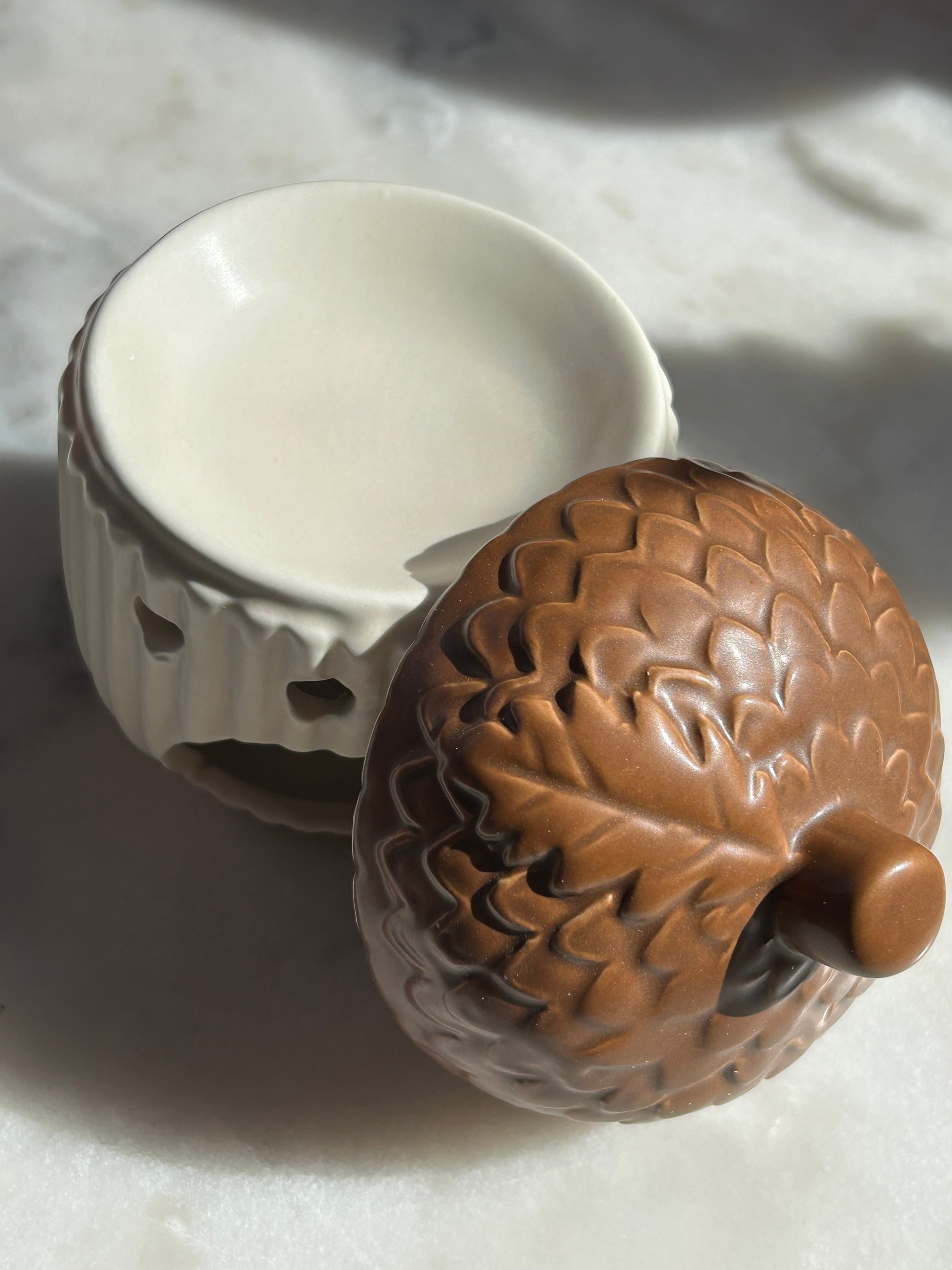 Ce brûleur raffiné en forme de gland, aux tons chaleureux de beige et de marron, diffuse délicatement vos fondants parfumés préférés tout en décorant avec élégance votre espace. Son design inspiré de la nature crée une atmosphère apaisante et réconfortante, idéale pour vos moments de détente.